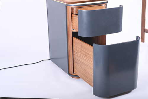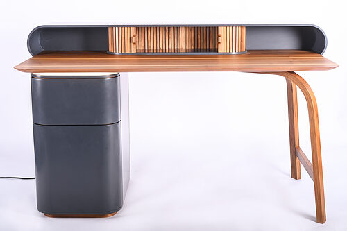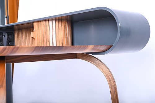 Der Schreibtisch „CIRCUM“ ist für Wohnräume ohne separates Arbeitszimmer konzipiert und steht exemplarisch für die gelungene Verbindung von Gestaltung und Funktion. Er kombiniert amerikanischen Nussbaum mit graphitgrauem HI-Macs Mineralwerkstoff zu einem modernen Möbelstück mit klarer Formensprache. Korpus, Rollladen und Beine sind präzise gearbeitet und vereinen traditionelle Techniken wie Zinken und thermische Verformung mit modernster CNC-Technik. Durch Details wie die LED-Beleuchtung entsteht in Kombination mit dem Holzgestell eine leichte, funktionale Gesamtwirkung.