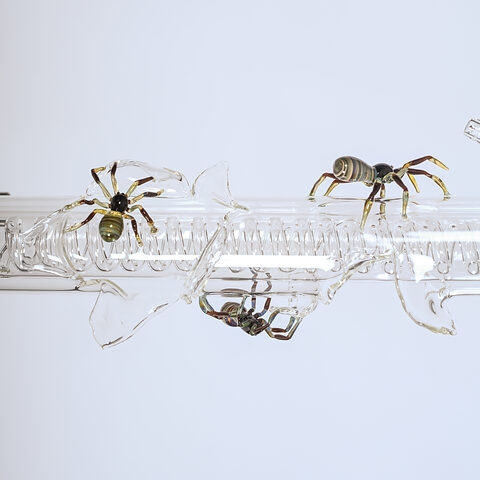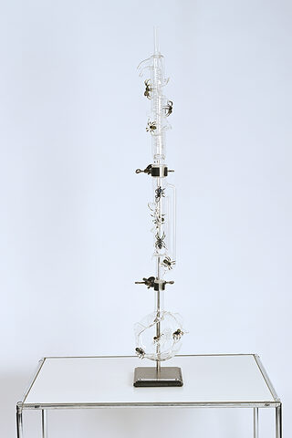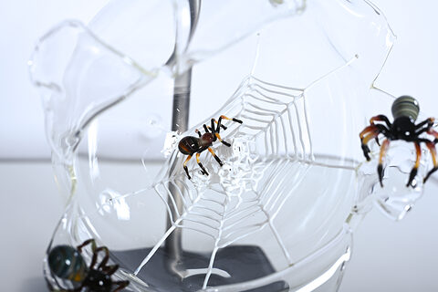 „Spinnen Extraktion“ eröffnet eine ungewohnte Perspektive auf die Verbindung des Technischen Berufs des Glasapparatebauers mit der Glaskunst. Das Objekt aus farbigem und transparentem Borosilikatglas basiert auf der Form eines Extraktionsapparats. Spinnen und Spinnennetze sind ohne Klebung mit dem Glas verschmolzen, wodurch eine filigrane, geschlossene Einheit gebildet wird. So entsteht ein Werk, das präzises Handwerk mit gestalterischem Ausdruck vereint. Das überarbeitete Stativ dient als Präsentationsbasis und ist Teil des Gesamtkonzepts.