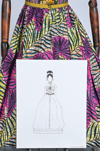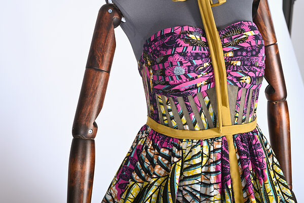 Das bodenlange Kleid „Gott im Zentrum“ zeichnet sich durch die Kombination eines afrikanischen Wachsstoffes in leuchtenden Farben mit einer femininen Silhouette aus. Der zentrale goldene Streifen vom Hals bis zum Saum verweist auf Gott als die ordnende Mitte und bildet das gestalterische Leitelement. Schnittdetails wie das körpernahe Oberteil, ein Cut-out in der Taille und ein voluminöser Rock ergänzen die klare Linienführung. Farbgebung und Materialauswahl unterstreichen die symbolische Ausrichtung des Entwurfs.